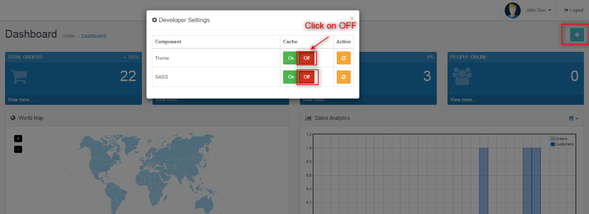 - Open Oencart backoffice and you can see the rigth side of setting button .Click on the Setting button .(Settings > Developer settings). Click on OFF .