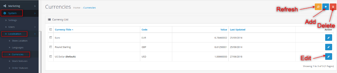 - Open Opencart backoffice and navigate to the System > Localisation > Currencies .
