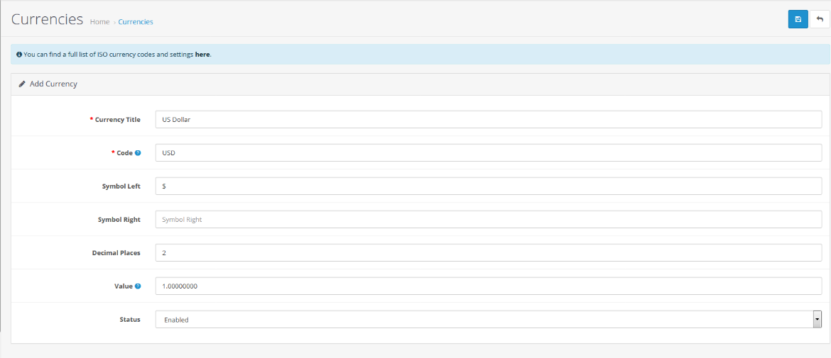 - Status:The currency can be used only if it is Enabled
