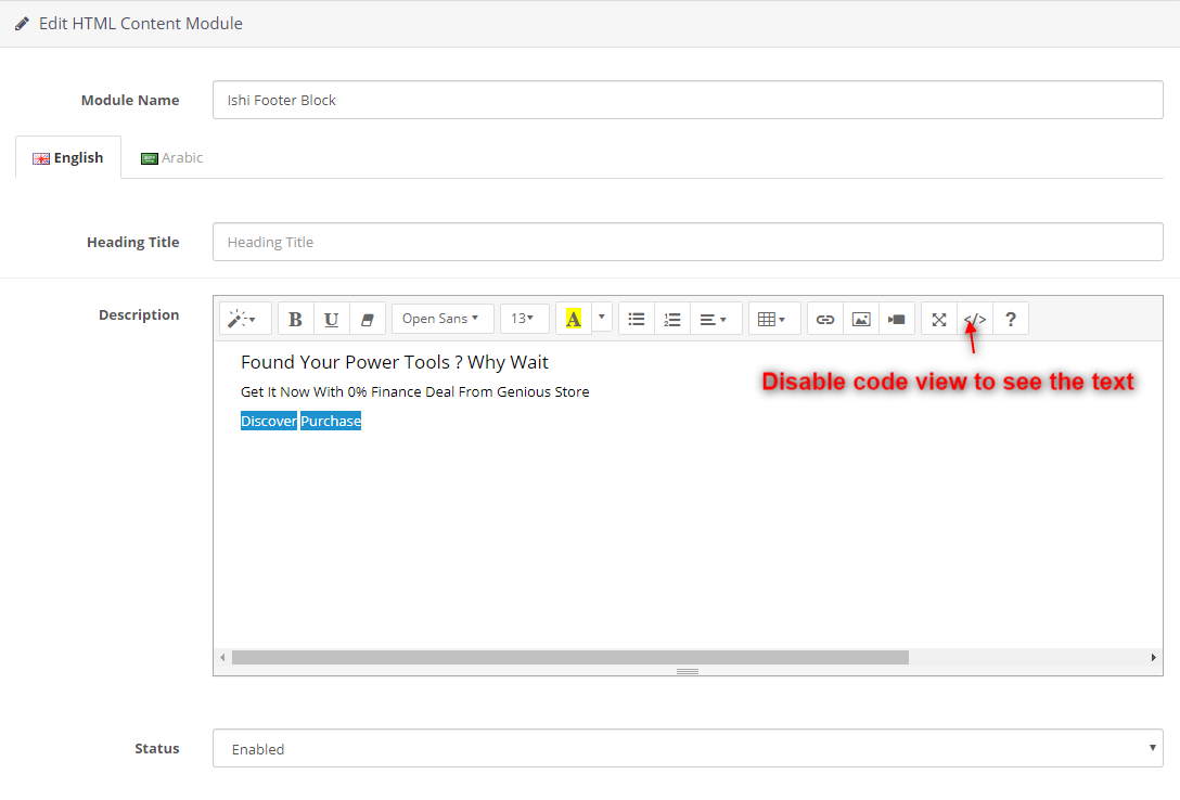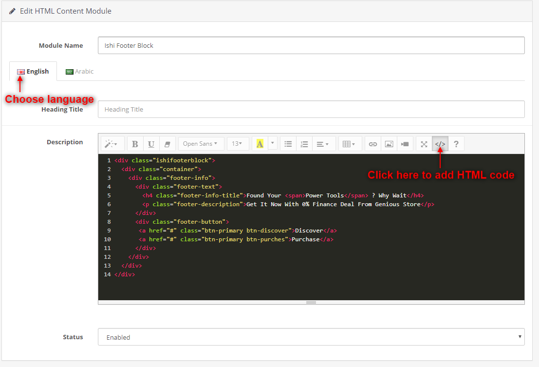 Once you have installed module.Click on the Edit button You will be navigated to HTML Content configuration page.