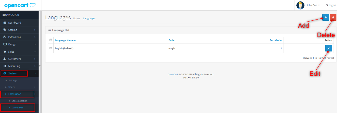 - Open Opencart backoffice and navigate to the System > Localisation > Languages .