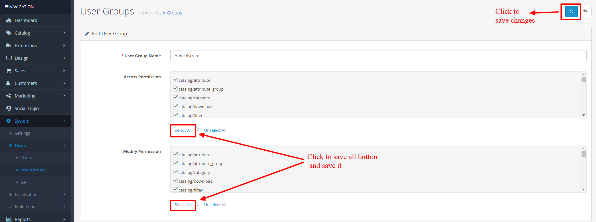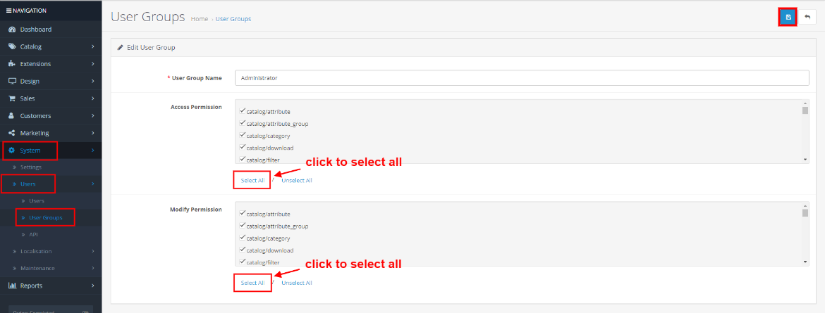- Next, go to System -> Users -> Usergroup and edit ‘Administrator’ to provide administrator permissions to the extension.