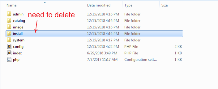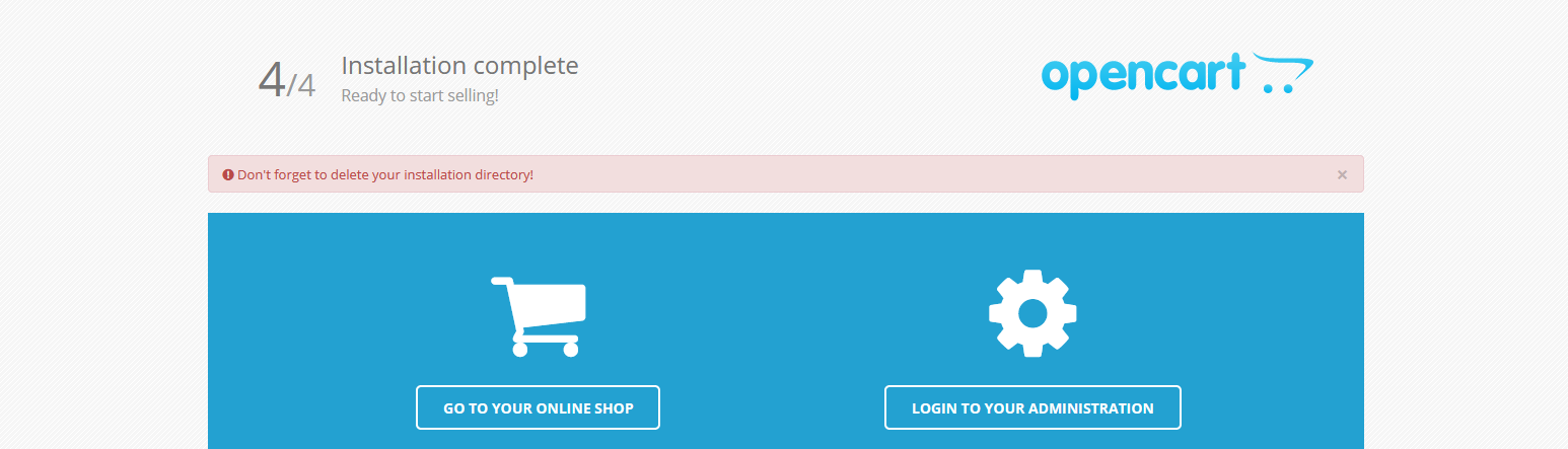 After Opencart is installed, you must delete “install” folder in your Opencart.