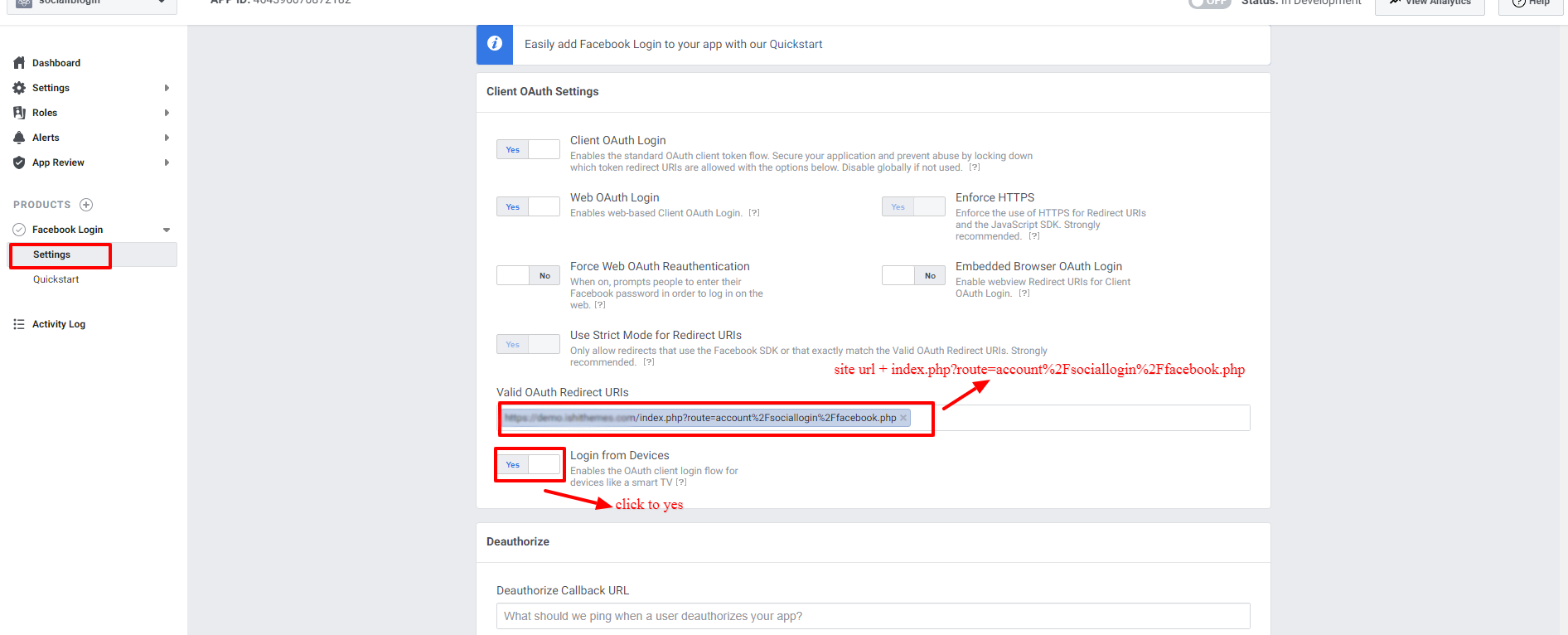 - Go to Facebook login > Settings. And Enter valid OAuth Redirect URLs.