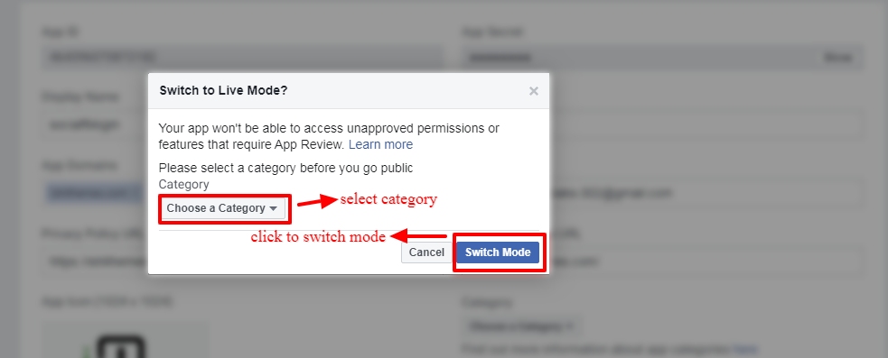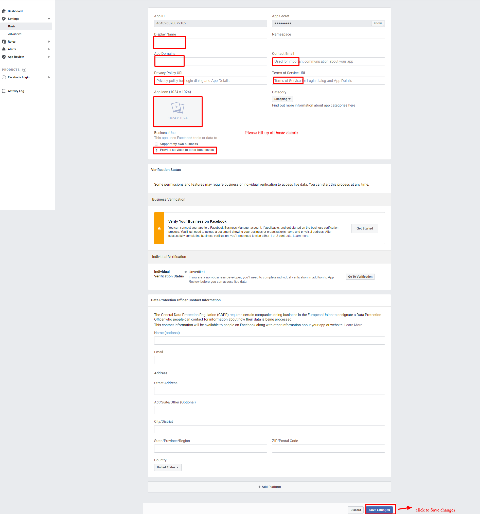 - Now, go to setting > Basic and Configure all your basic app settings such as App Name, Logo, Privacy Policy URL and Terms Of Service URL. Save your changes and the App is ready to go live.