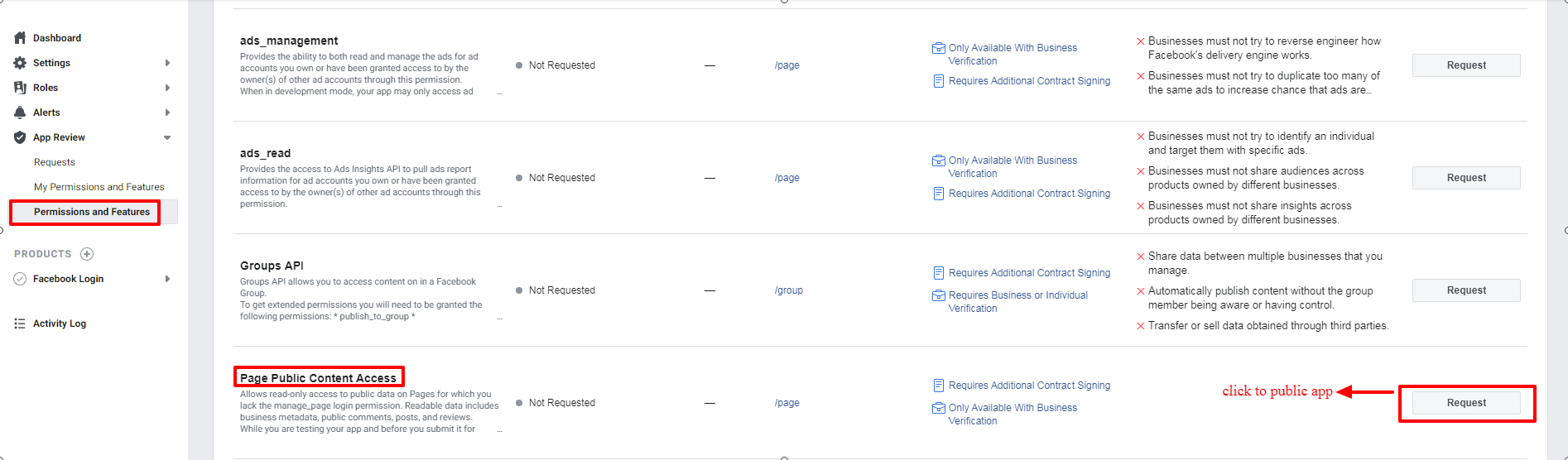 - To set your app public, Go to App review > permissions and features. Search for "Page Public Content Access" and click on Request Button.