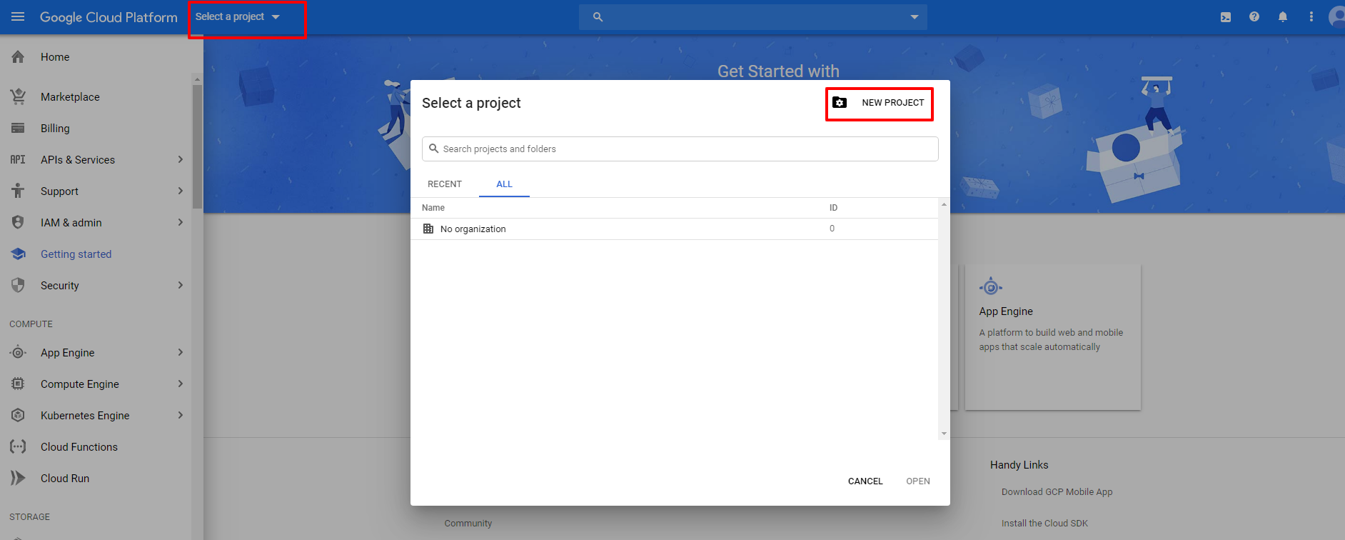 - Click on Select a project from the Top bar. A popup opens from which you need to click on "New Project" as shown in the screenshot below.