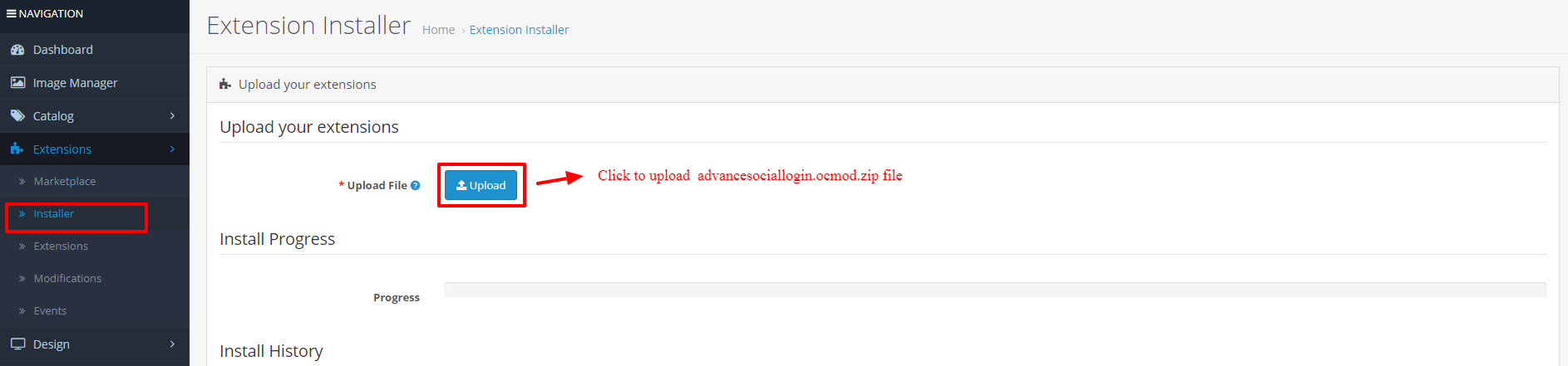 - Once you have copied the folders in the previous step, then login to admin and from the main menu go to Extensions->Extension installer and upload the ZIP file – "advancesociallogin.ocmod.zip". The ZIP file can be found root folder of the downloaded zip.