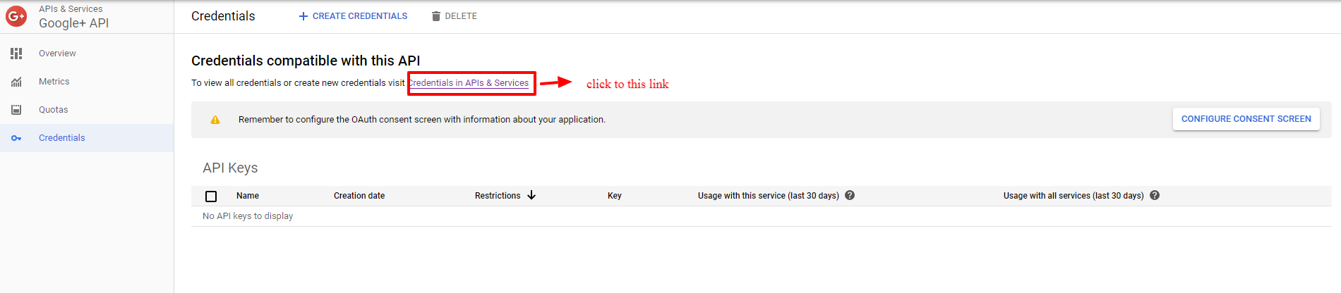 - In the Google+ API configuration, Go to Credentials > click "credentials in APIs & services"
