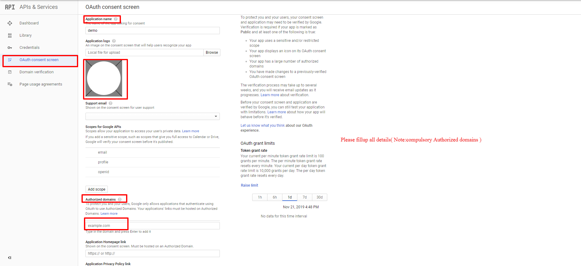 - Go to Oauth consent screen and fill up all fields like(Application name, Application logo, Authorized domains). Do not forget to save your changes.