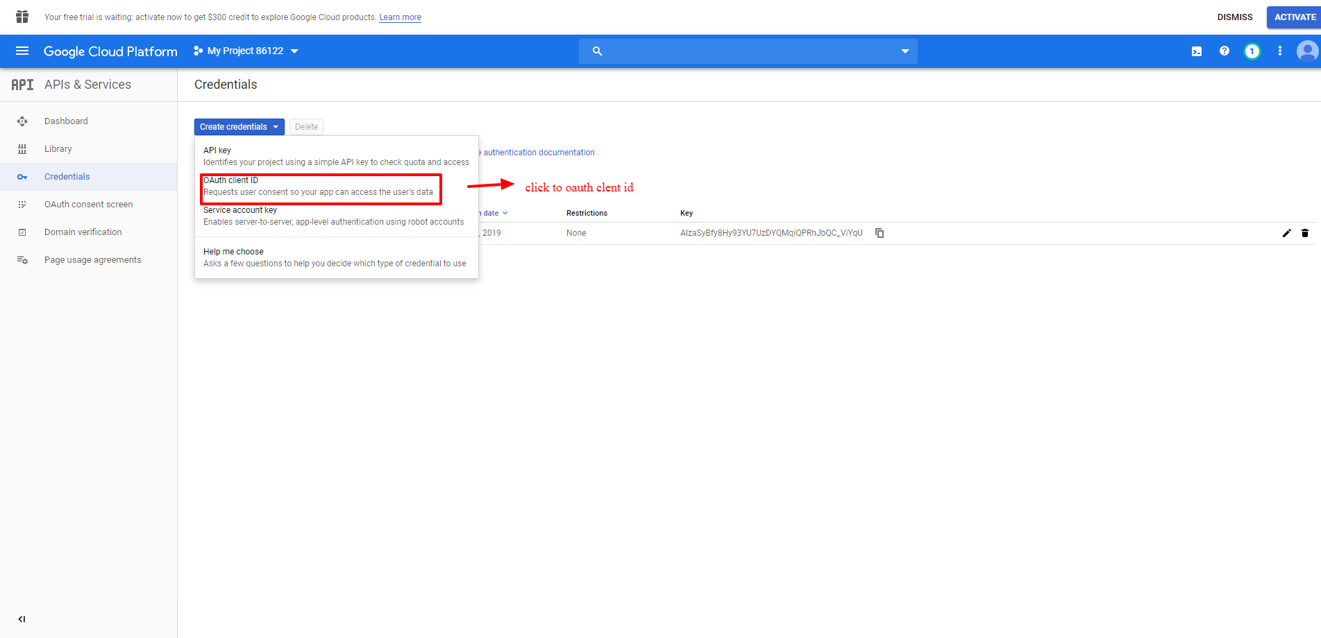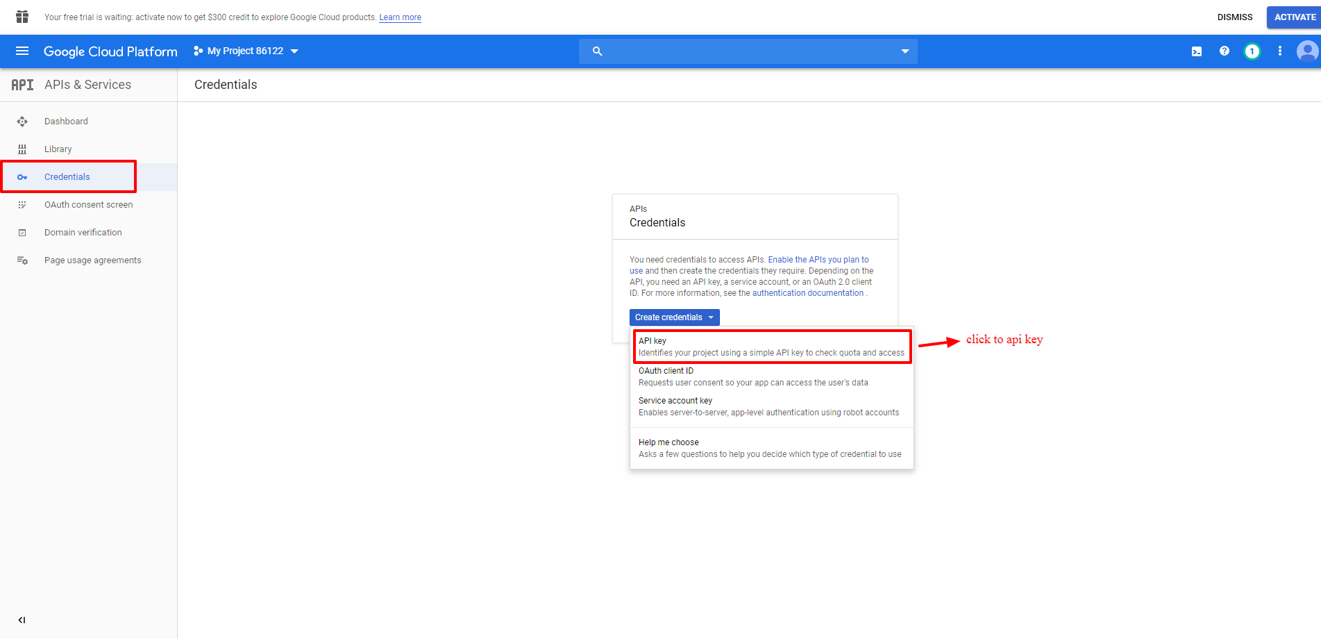 - To Create the Api Key go to "Credentials" and Select "API Key" from the dropdown.