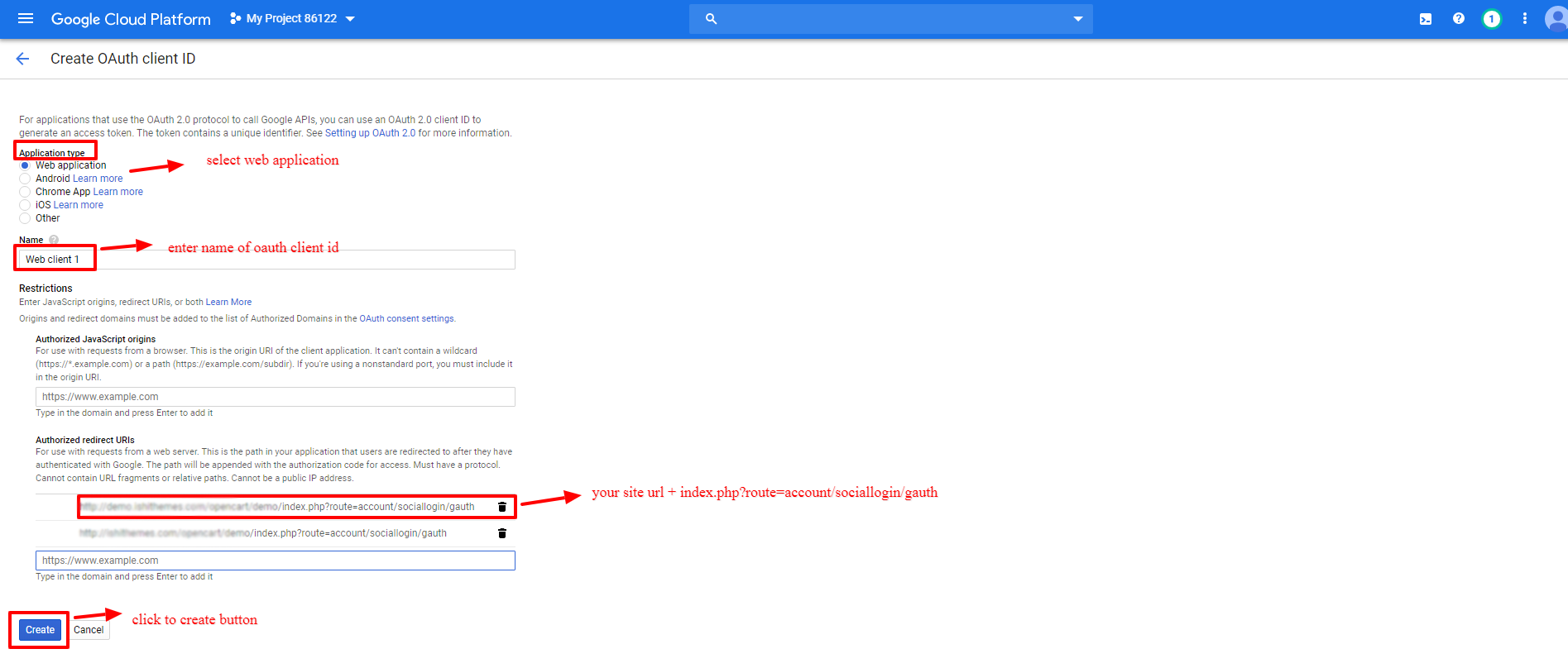 - C)Authorized Redirect urls : If your store url is https://www.google.com/ then your Redirect URL should be : https://www.google.com/index.php?route=account/sociallogin/gauth