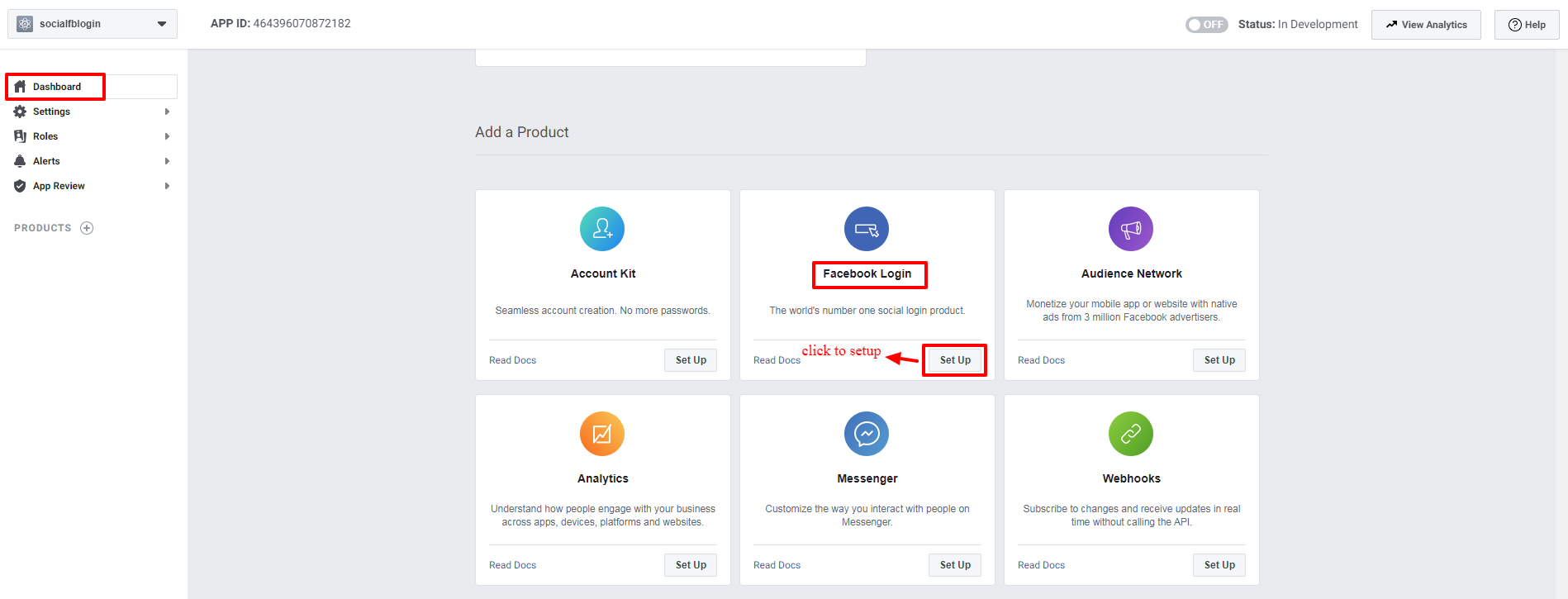 - After Creating a new App. Please go to the dashboard of your facebook developer account and click on "Setup" as shown below.